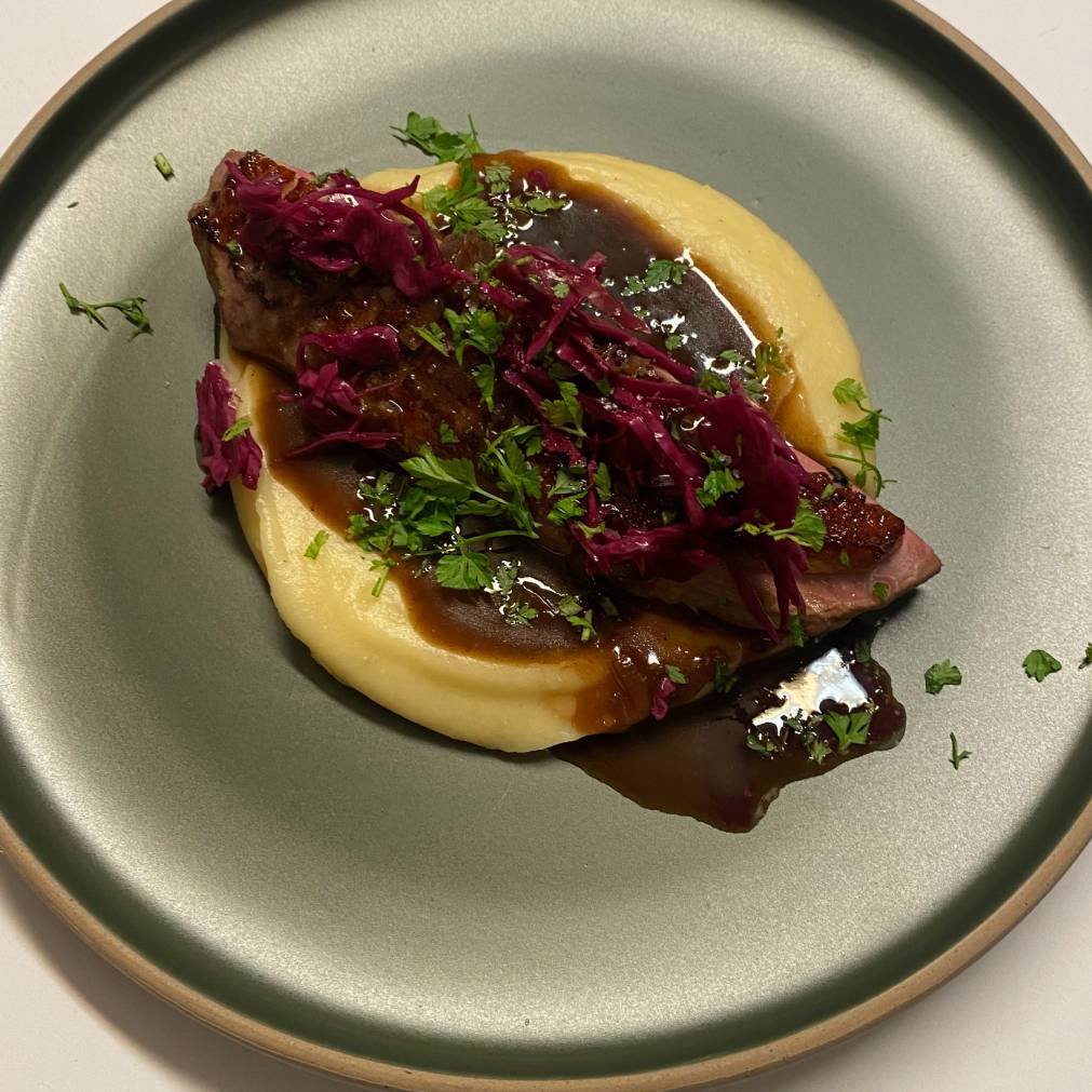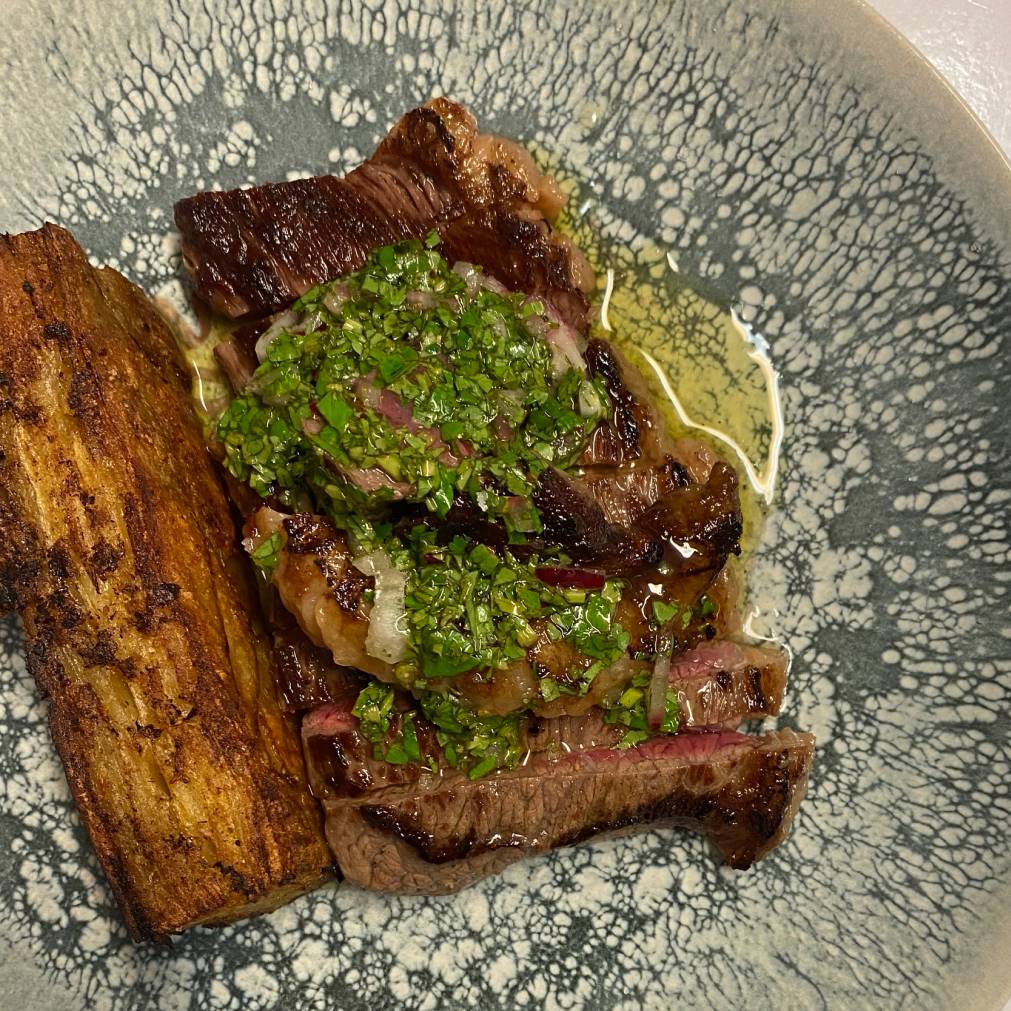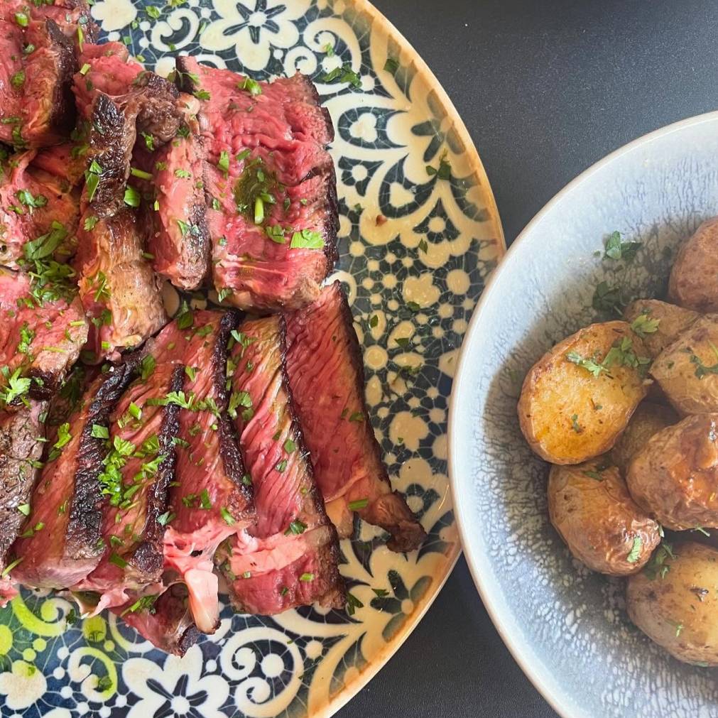 Coeur de rumsteck (+/-220gr), grenailles rôties à la graisse de canard et sauce à l'ail (+5€)