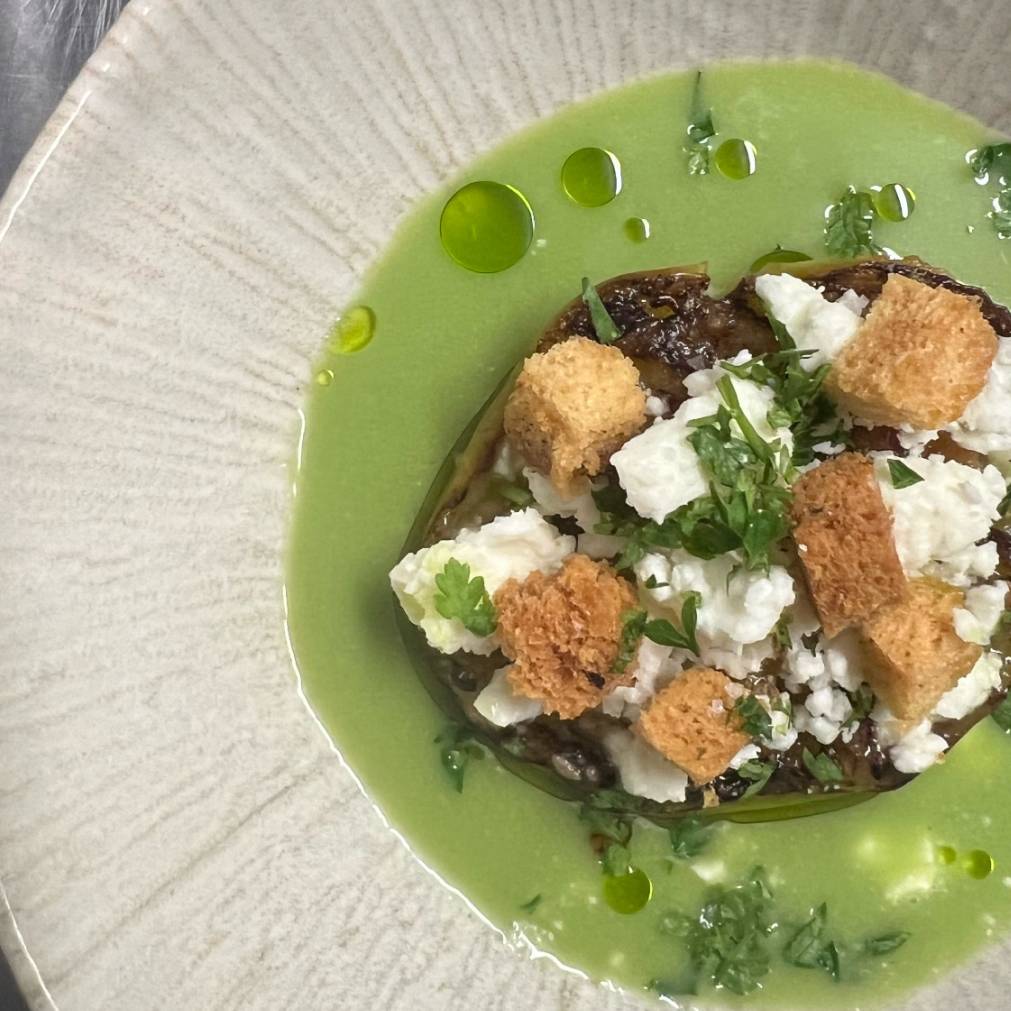 Velouté de chou-fleur au raifort, oeuf parfait, salsa pomme verte, aneth et croutons